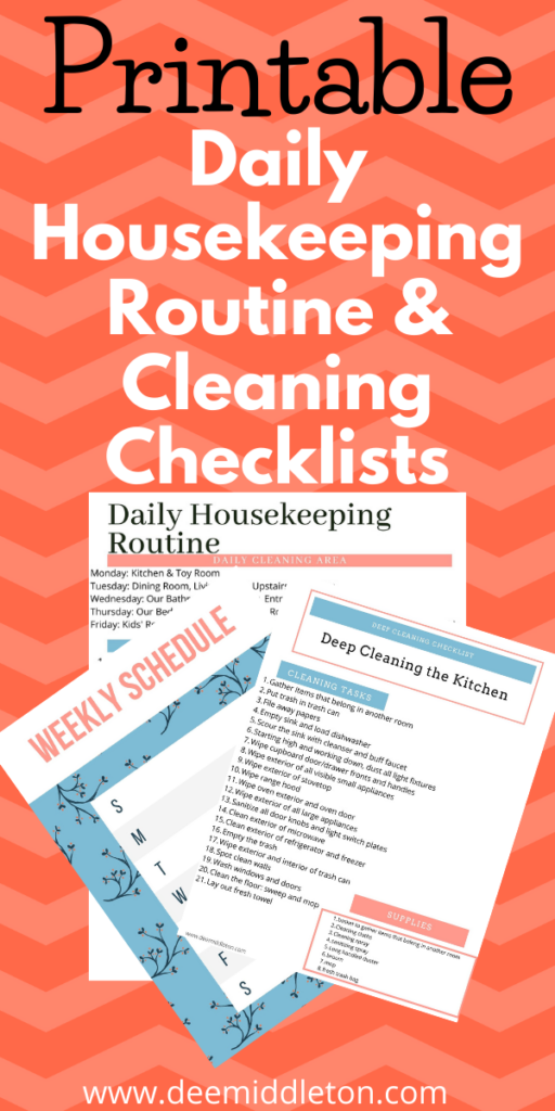 You can get your printable Daily Housekeeping Routine and Deep Cleaning Your House Schedule here. This 15 page printable kit is delivered digitally to your email for you to print and personalize. What Does a Deep Clean Include? It includes a daily schedule, calendar pages, and deep cleaning checklists for every room and area of your home. Below is a sample page of what you’ll get in my printable set designed to help you create your personal Housekeeping Schedule Printable.